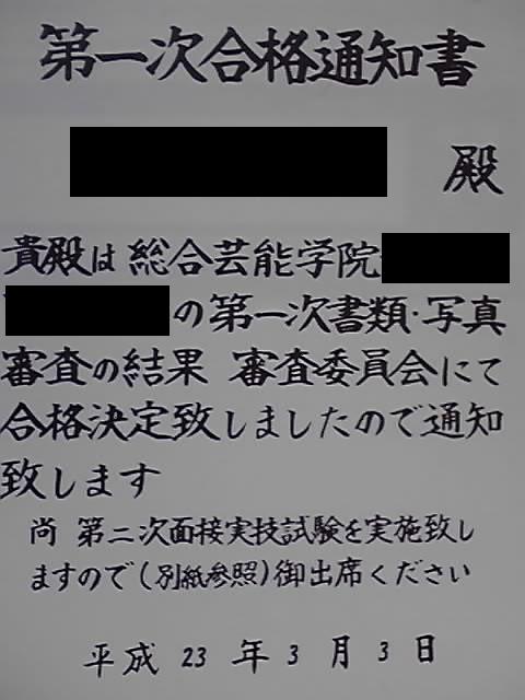 今朝母親が帰って来た時にふと渡されたのですが (クリックで原寸大) 先日言っていた タレント養成所の件 (新しくページを開きます) 一次審査通っちゃったよ なん……だとっ!? しかも大阪梅田校だとっ!? 普通に行ける距離じゃあねーかっ! そんなバカな……1次審査も通ると思って無かったのに…… だって、分校を作るって事は相当でかい養成所だよ!?ww しかもこの不細工の写真で通るとは……… 勝手にされた奴だから凄くやる気ないwwwww ちなみに、二次審査は実技 演技、歌唱、ダンスを試されます。 演技は台詞を読み 歌唱はジャンル問わず(多分アカペラだよ) ダンスは流れる曲に合わせて動け。 と言う奴なんだけど、 演技はまだいい。 だが、歌唱とダンス。てめーらは駄目だ まず歌唱。ただでさえ音痴なのにアカペラとか無理っすw あとダンス。出来ない事はないかもしれないけど 僕が適当に踊るって言ったら マイケルにしかなんねぇぞ いやねぇ……魅力的ですよ。確かに。 歌と、演技、ダンス。どれも隙間ない授業内容ですよ。 でも 歌とダンスがある限り僕は 二次審査なんか突破できるわきゃないw いやね。審査時は素人ばかりですよ。そりゃそうですよ。 でもねw僕の歌は他の奴を全てブチ壊すほどの能力なんですよw 入学したらみっちり歌唱コースですよwwww ダンスはね。マイケルにしかならないから困るんですwwwww あ~行きたくないな~ |